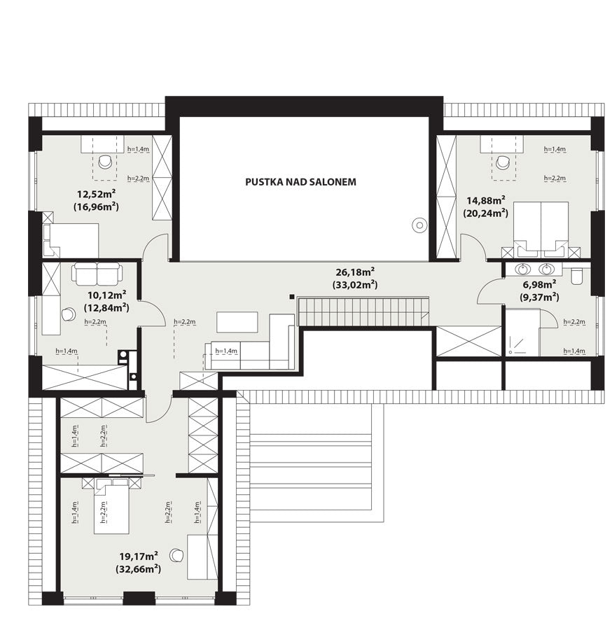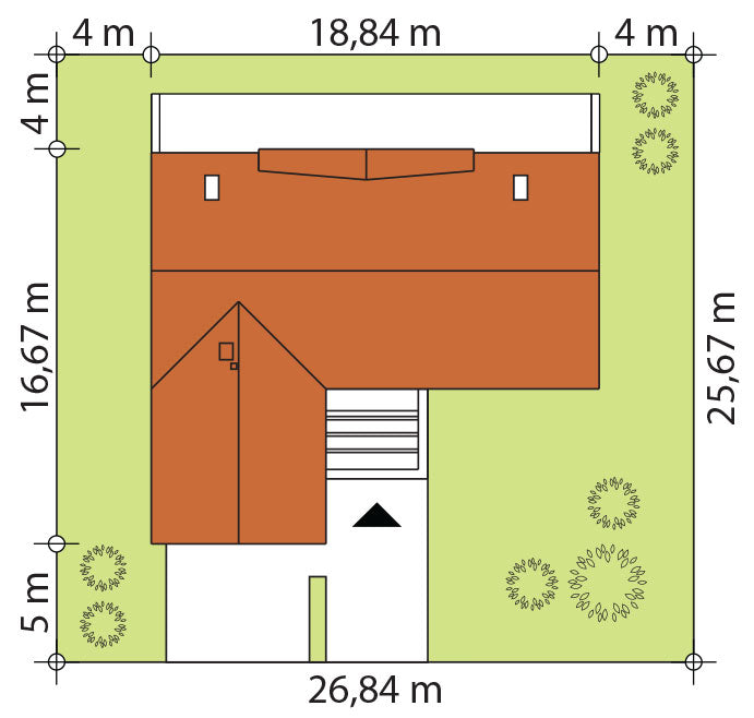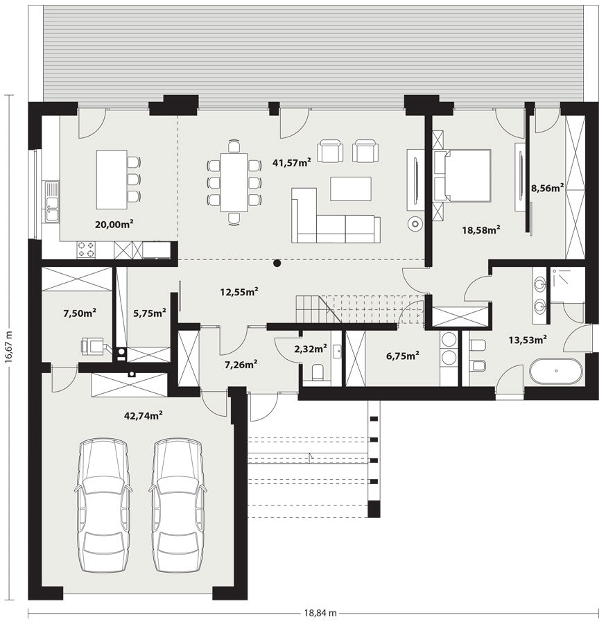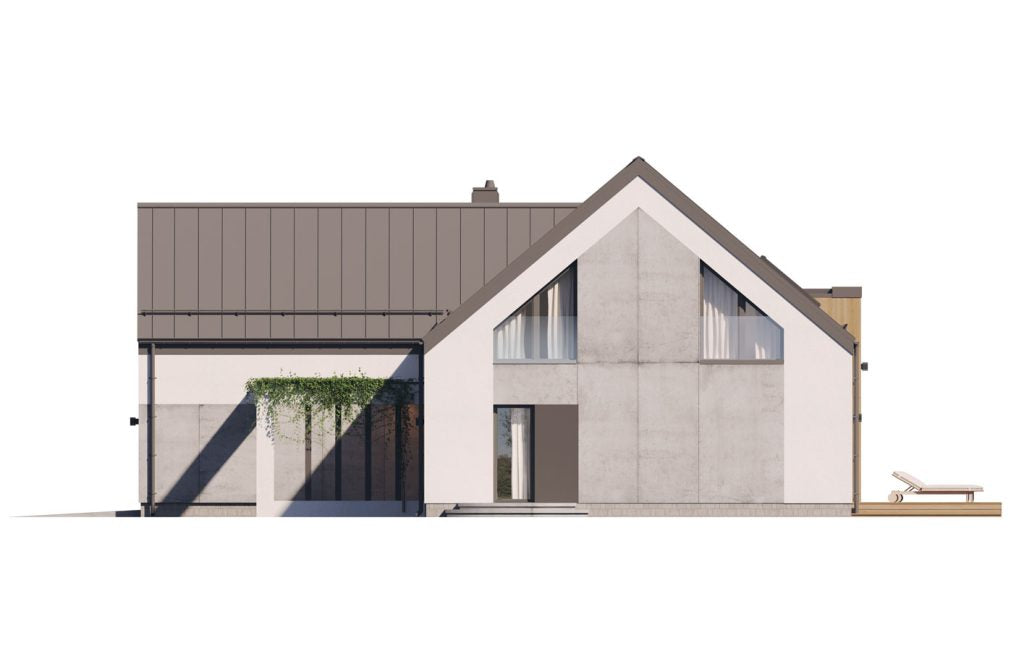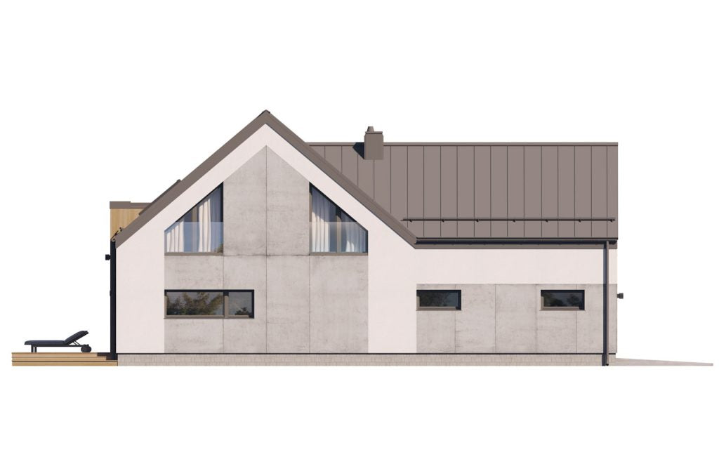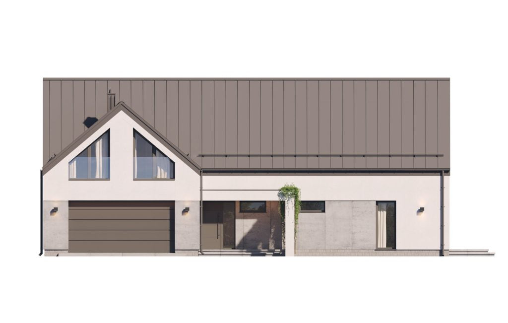 Charakterystyka budynku: Dom o powierzchni użytkowej 196 m² usytuowany na planie litery L, przykryty efektownym dwuspadowym dachem. Nowoczesną stylistykę podkreślają ogromne przeszklenia w strefie dziennej oraz podwyższony salon z antresolą, które zapewniają niepowtarzalny klimat wnętrza i doskonałe doświetlenie.