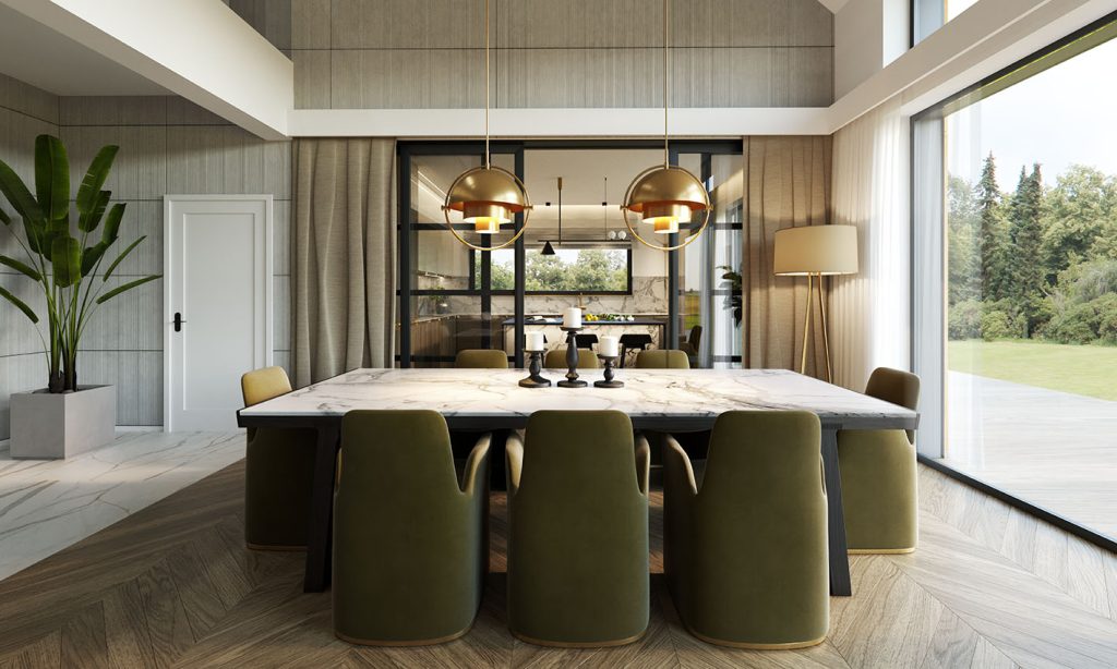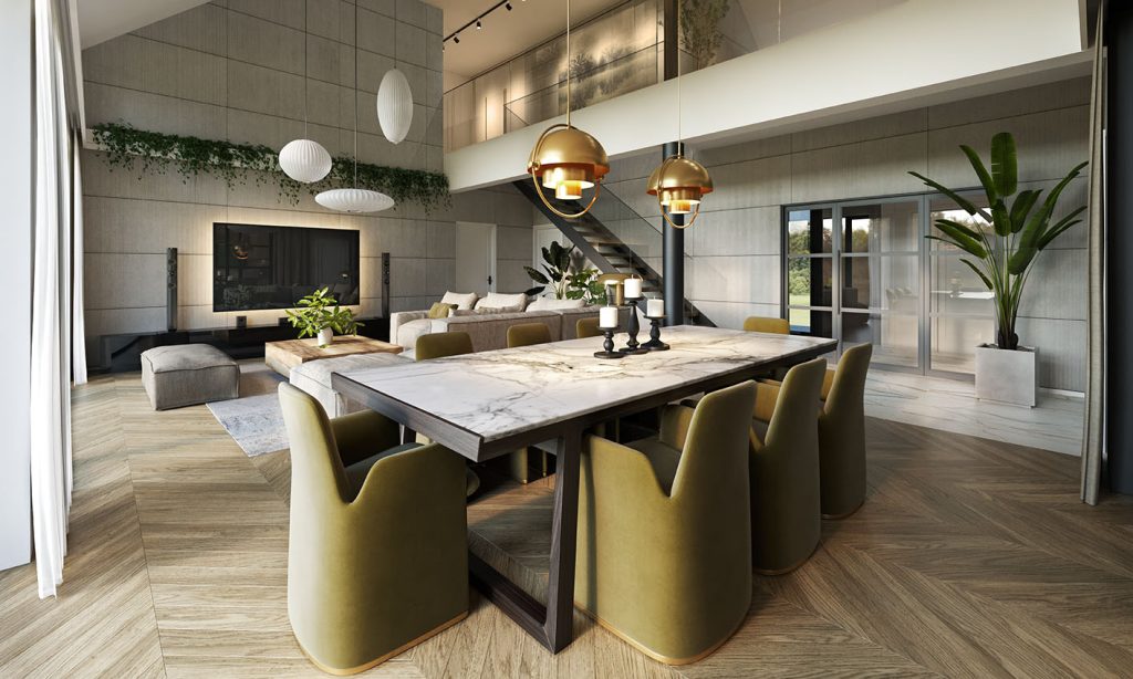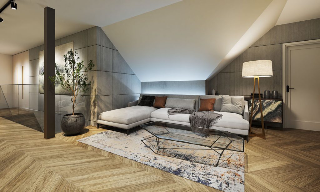 - Strefa nocna: 5 sypialni (w tym duża sypialnia z garderobą na parterze), 3 łazienki, gabinet na poddaszu